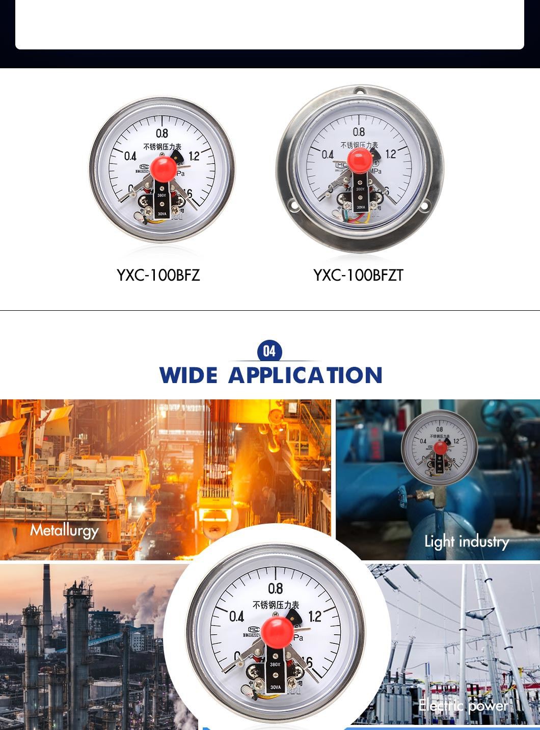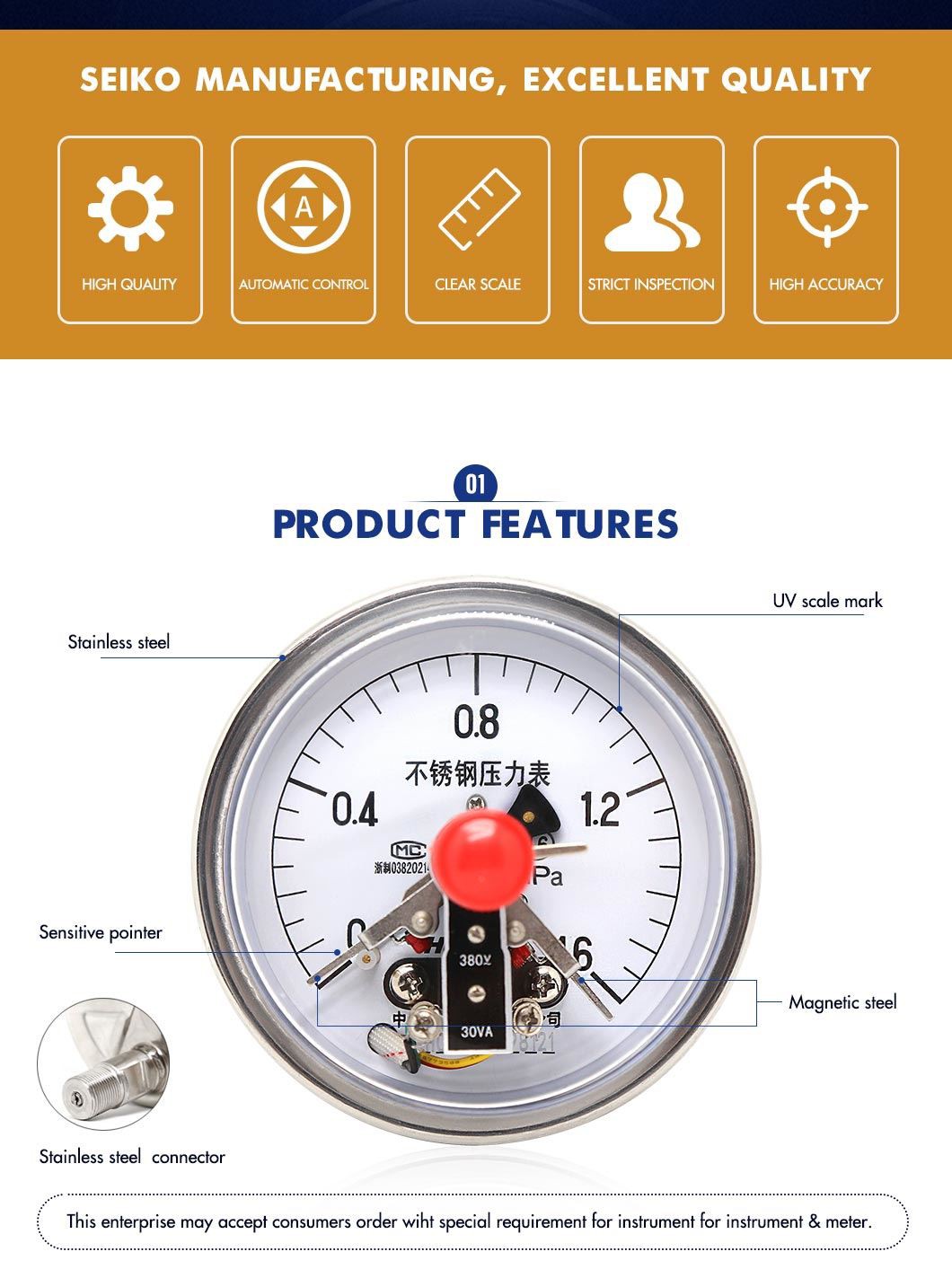 فشار سنج تماسی برقی از جنس استنلس استیل Dia100mm می تواند فشار انواع رسانه های خدماتی را اندازه گیری کند.